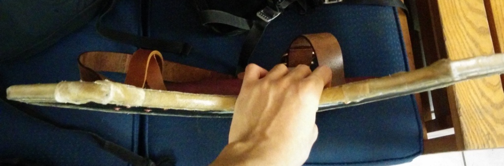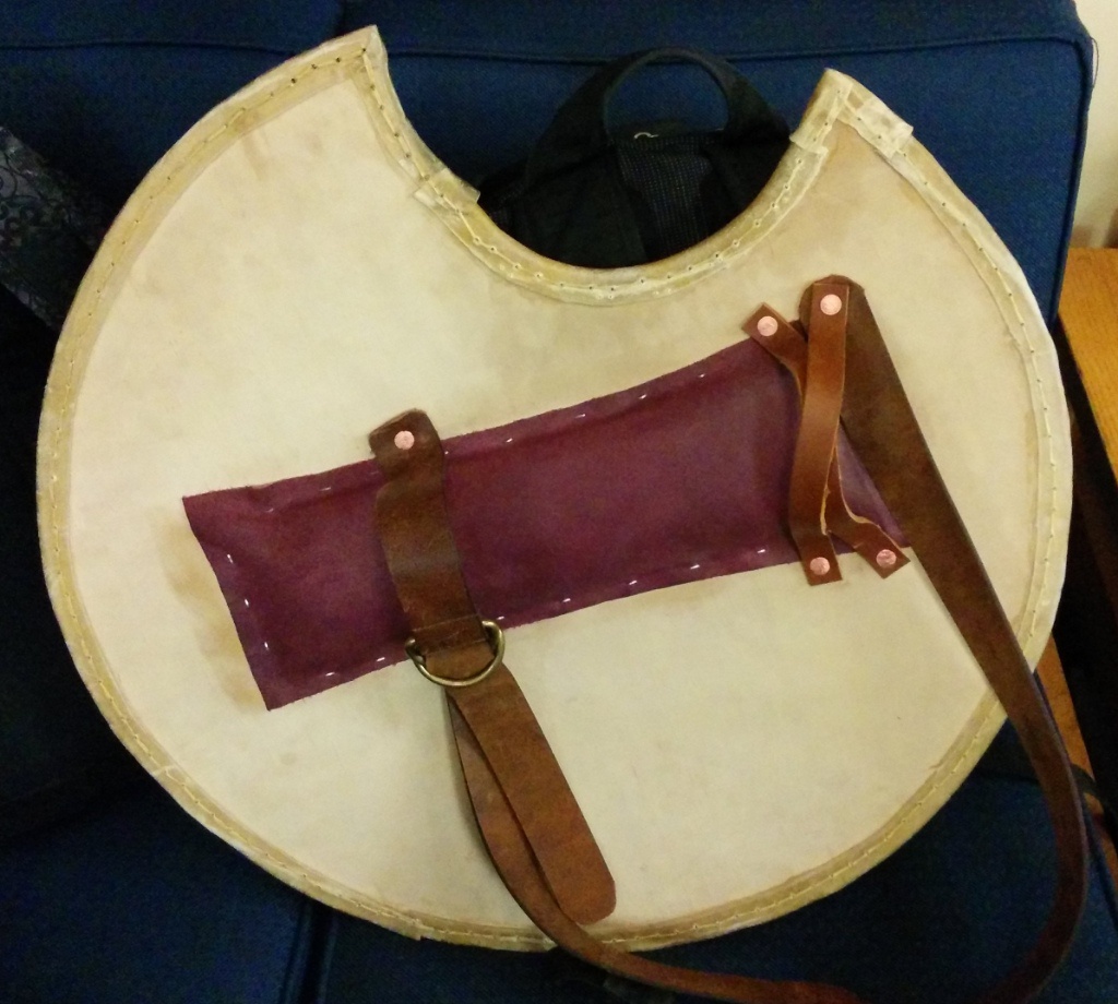 Basic "modern" construction--two pieces of 1/4" plywood glued together over a form to impart a curve. Covered front and back with linen. Painted with acrylics and given a coat of poly. Enarms and guige are leather, held on by carriage bolts, which will make it easier to replace the straps after I finally get some decent buckles.