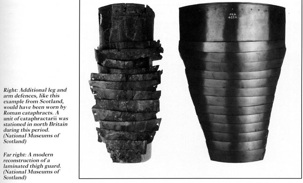 I have come across something somewhere which says that those "cuisses" might actually be vambraces. Either way their construction does seem to be similar to the limb defences apparently being worn by gladiators, Parthian cataphracts etc.