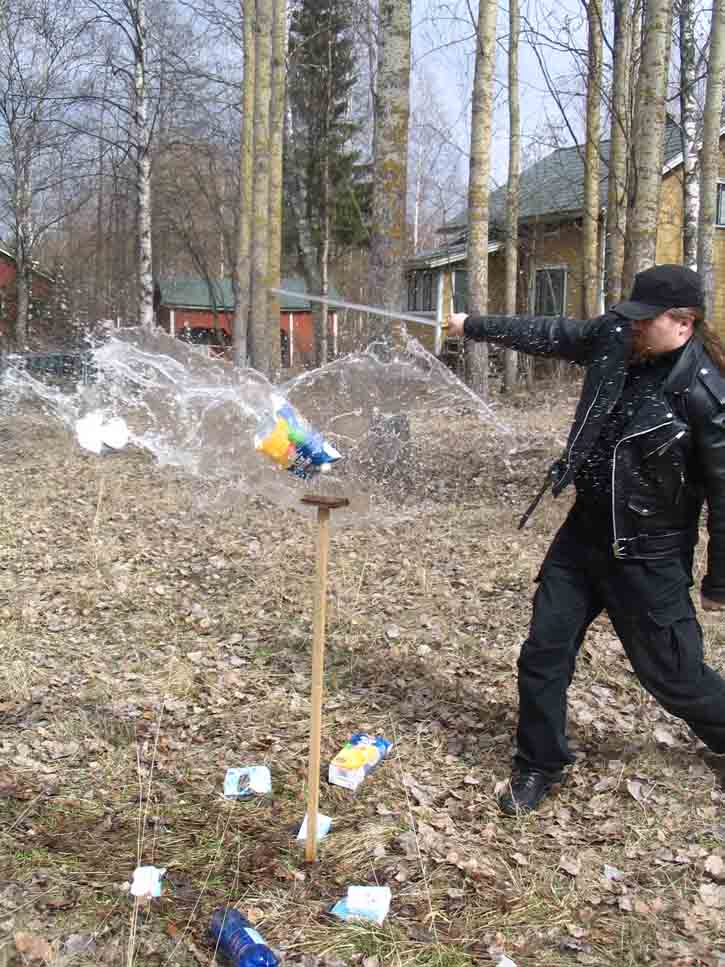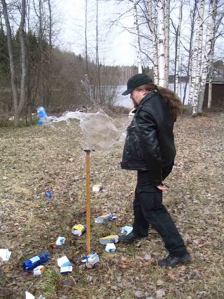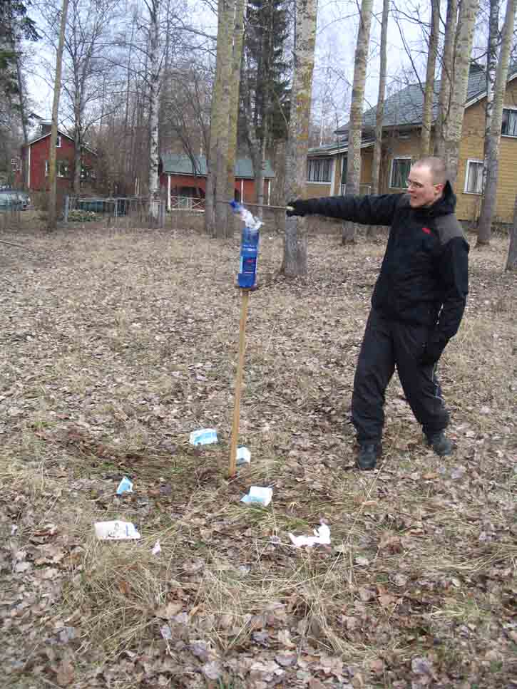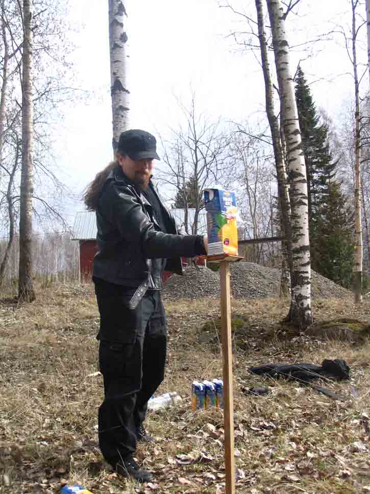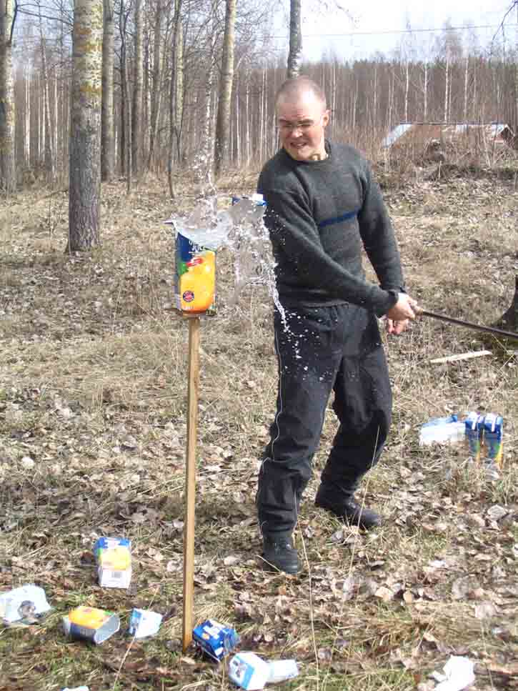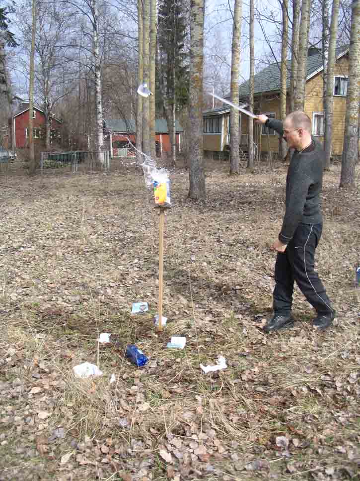 Last sunday I had a chance to see my good friend Mikko Remes, and well -surprise surprise- we had to play with some sharp things :p We both had newly made items to introduce to each other. Mikko had made the seax http://www.myArmoury.com/talk/viewtopic.php?t=9661 and I had made the spatha and holbein dagger http://www.myArmoury.com/talk/viewtopic.php?t=9748 . We thought that if we found some empty milk cartons, we might as well do some cutting, and test the swords. With the favourable help of Mikkos mother-in-law (and the understanding/sympathising glance of Mikkos wife), we got milk cartons and plastic bottles, even more than we had hoped for.
