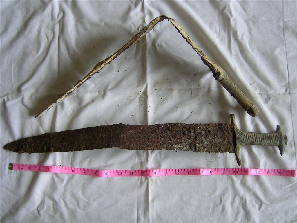 The damage to one sword was done by the excavator bucket... these were unearthed only yesterday (Saturday 23rd June ) which is why I was called to try and I.D them (Archaeological background...) ... but I don't have enough expertise in this area to be be sure...