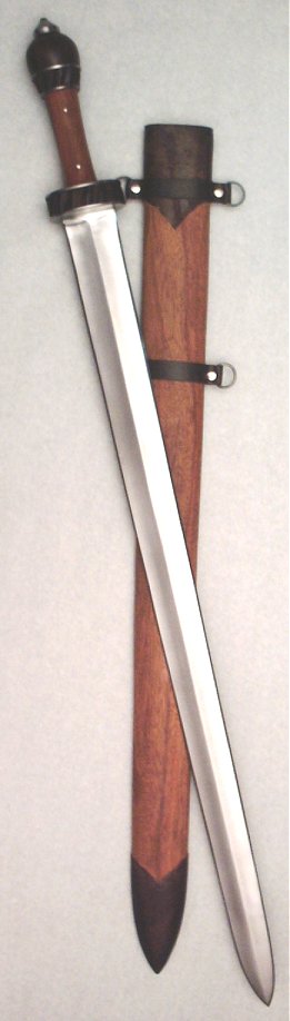 Sharpened carbon steel blade and a full tang. The hilt is constructed of wood and metal. The wooden scabbard is accented with a leather throat and tip.