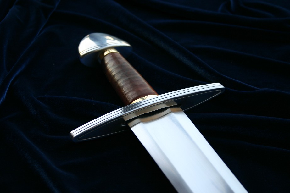 steel cross and pommel,beech grip with hemp binding and calfskin,finished with brass collars.