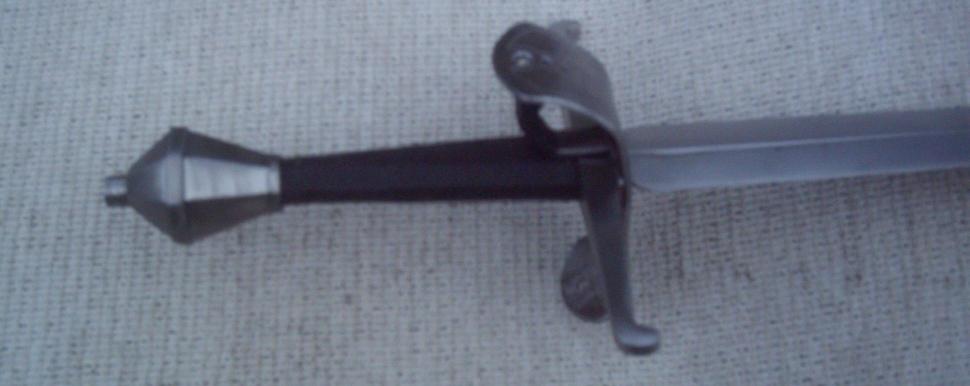 Also, there's just no way I could afford it any other way, as even full-price MRL stuff is pretty much out of my price range. I got the blade as MRL's "english knightly sword" a few years ago on super blowout sale for less than $100. The steel for the fittings I made was a few dollars, and the wood came from my back yard!