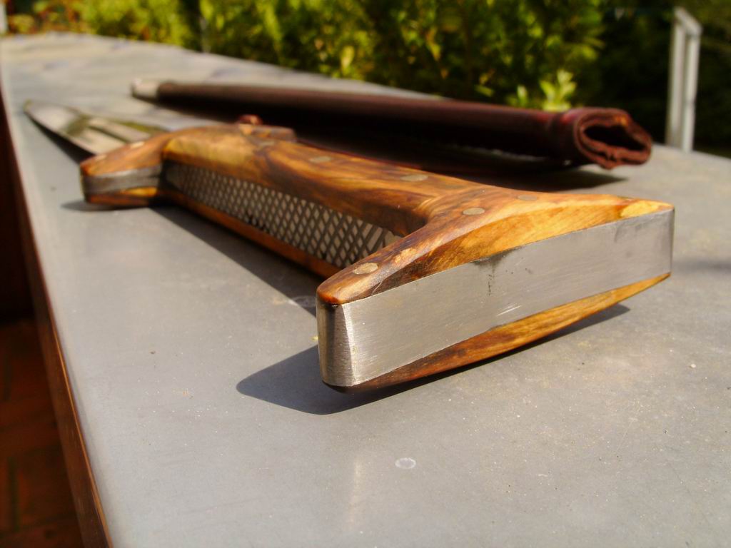 Regarding the construction I had to make some guesses from the picture of the original I was sent and am glad I seem to have got it right. The guard was constructed by fitting a shaped metal plate on either side of the blade and rivetting them together so the rivet just passes through the blade edge and so the metal plates are prevented from moving up or down the blade. The plates were then drilled and the wood was rivetted to them. In the original picture, the blade widens just below the grip and there are traces of a rivet hole on either side and as the wood needed to be backed up with steel this seemed like the only way to construct it. The other reason that I felt this construction was the way to go is that the original is in a North Italian museum and this mode of construction is very similar to that of cinquedas which geographically fits well.