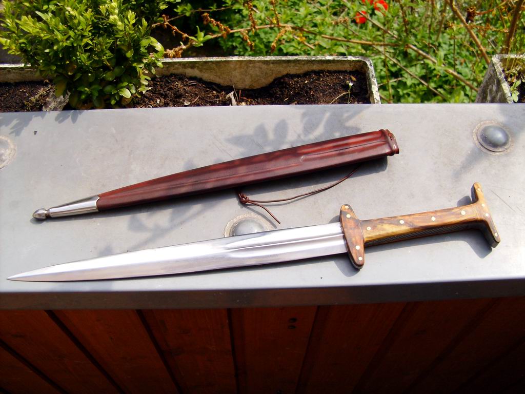 The dagger has an overall length of 42.5cm, with a double fullered blade of 29.5cm. It was delivered with a leather sheath in a rich chestnut brown colour. I let Tod decide for most part of the construction and the materials used. So he added some very nicely grained wood and some file work on the sides of the hilt. Im am really impressed by his work.