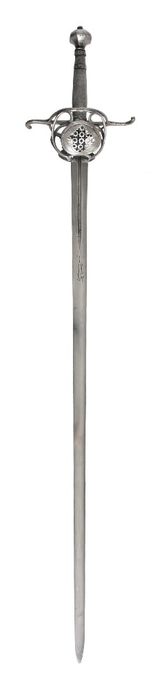 Straight, double-edged blade. Iron basket hilt has its characteristic shape, filled with pierced plates. Eightsided, facetted and twisted pommel. Iron wire wrapping with braided ferrules. Length 132.5 cm. |