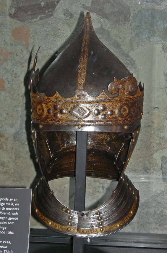 Getting even further in time from the Maciejowski Bible than Chad's examples, but here's crowned helmet which belonged to Gustav I Vasa of Sweden (reigned 1523-1560).