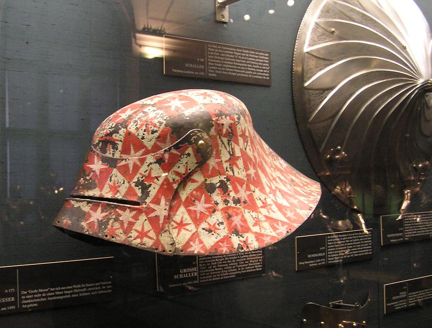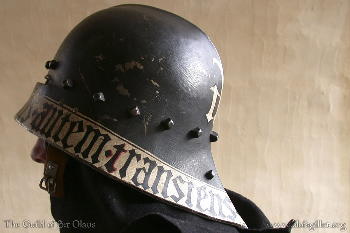 Does anybody have photos or any details on this or any other painted helmet of the mid-15th c.? I'm considering this treatment for a sallet of the same period. Can anybody cite a modern or contemporary source for painted mottoes or slogans on helmets in that period?