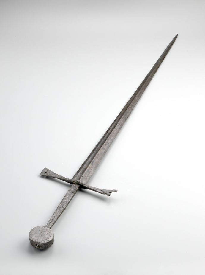 I absolute adore everything about this sword from an aesthetic perspective... Here, the question is about the pommel. Oakeshott claims that type V fishtails show up in art frequently in my target time period ... but after a lot of digging I haven't found any conclusive evidence. There are some manuscript illustrations that COULD show a fishtail, but again, no smoking guns.