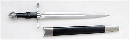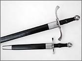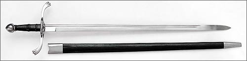 This sword has a single-edged backsword blade with twin fullers near the spine. The guard consists of two side rings and a recurved crossguard finished off by spatulated and decorative ends. The grip is leather covered wood with three raised ridges to enhance gripping ability. The pommel, a graceful apple shape, finishes off the sword hilt.
