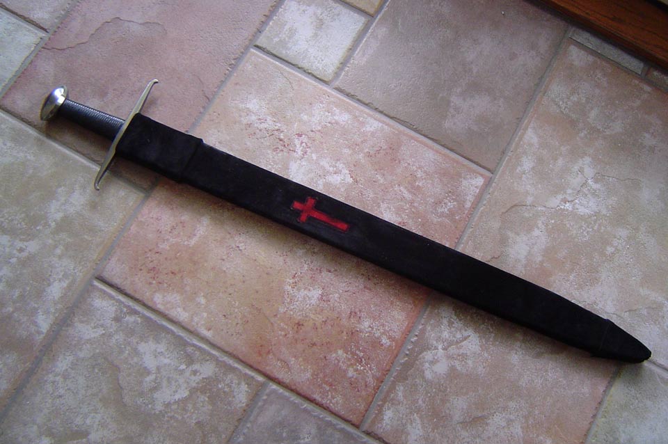 It had no scabbard, but I fashioned a custom fit suede covered wooden scabbard. Extremely tough, structurally sound scabbard. Red Crucifix is red suede inset.