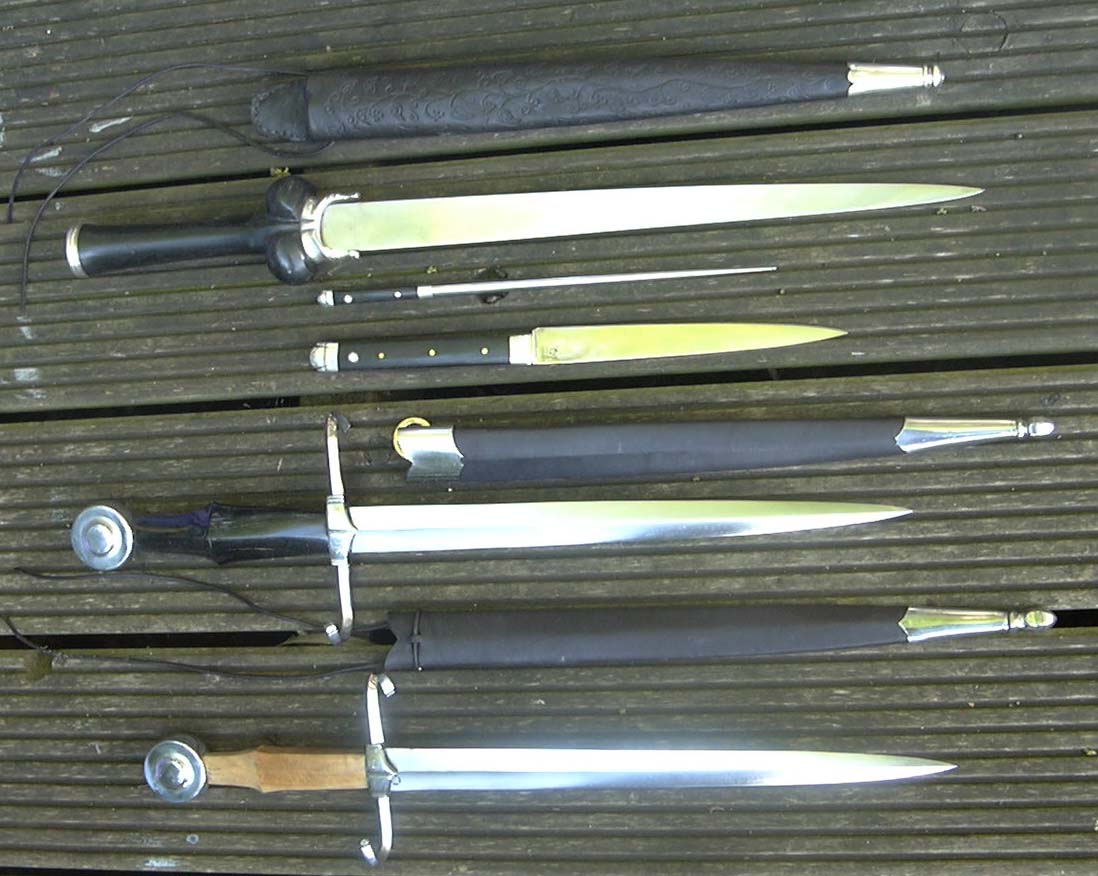 Anyway here are 3 daggers. The Wallace A732 inspired dagger has ebony handles and solid sterling silver fittings. The blade is 13 1/2" long, 1" wide and 1/4" thick, with very little distal until the last 3" or so. The byknife and pricker seem massive for their function but that is pretty much as they were. Interestingly the two studs on the byknife and pricker are on one side only and are to help draw out the pieces from the scabbard and as Nathan R observed in another thread a few months back, the construction of these scabbards is specifically that the main blade 'locks in' the secondary blades.