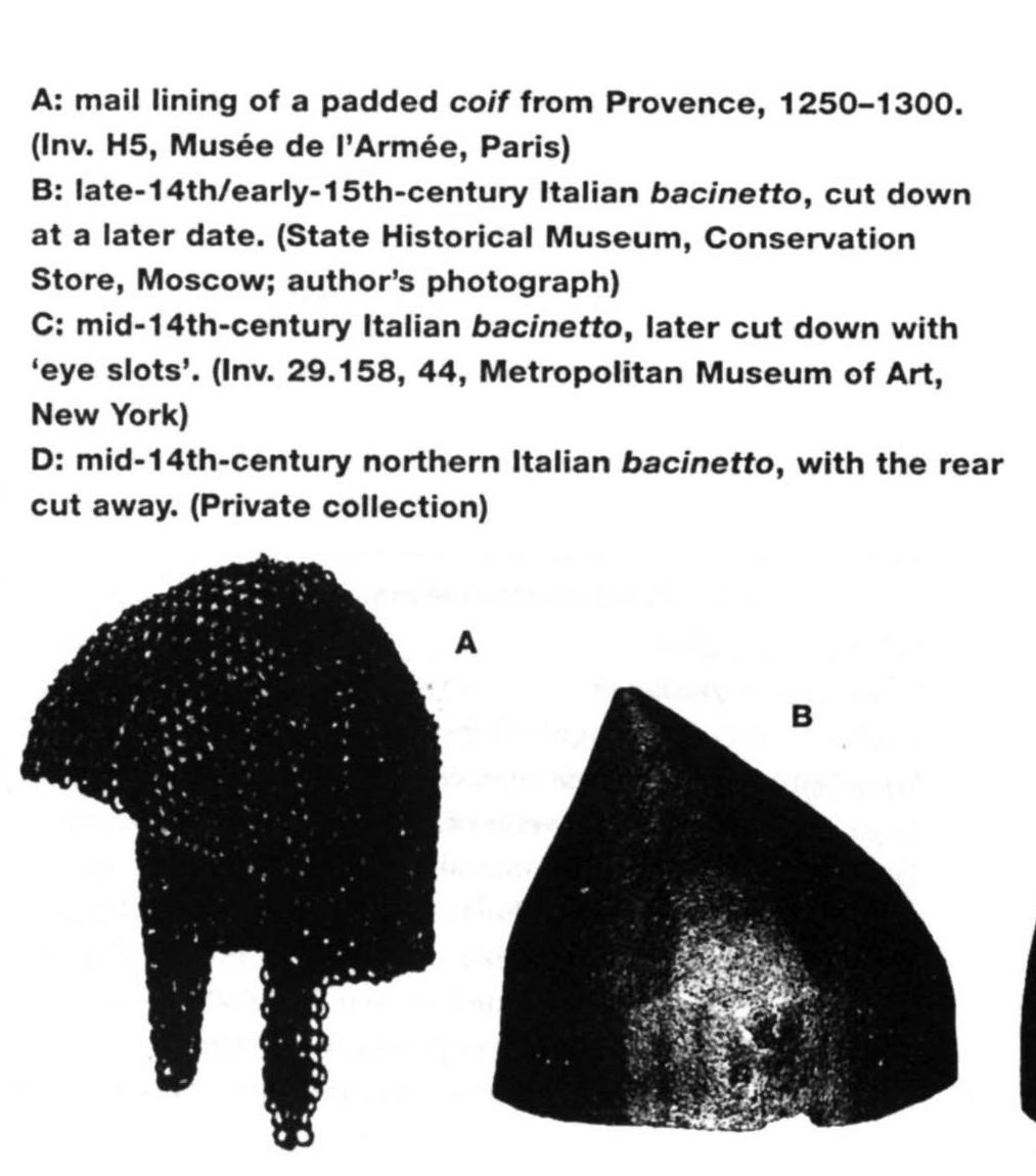 I've found this picture (the model A, obliviously) in the Osprey's volume "Italian Militiaman 1260-1392", n° 25 of the Warrior Series, at page 62. Someone know anything about it? I'm currently reproducing it with butted mail (being a very simple project and small), but I would like to know more.