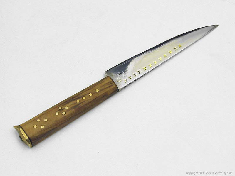 The tool steel blade is sharp and features inlaid brass X's and Tod's maker's mark on one side; there is filework on the spine. The grip is boxwood with decorative pins. The end plate is brass. The tooled scabbard is a deep reddish colour featuring a dragon motif.