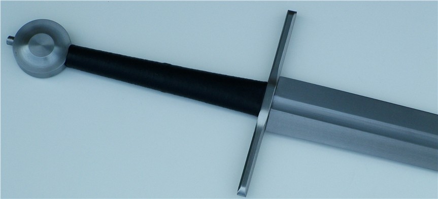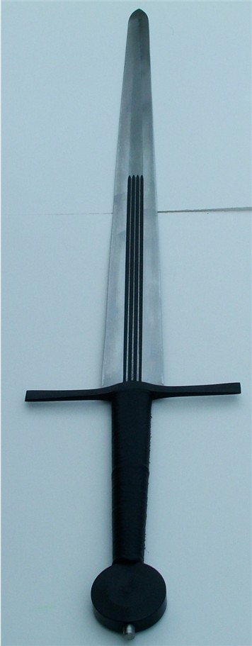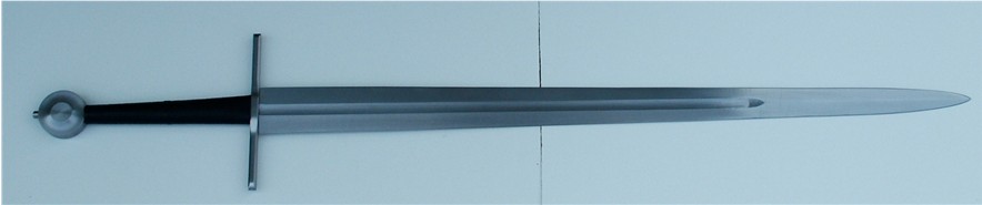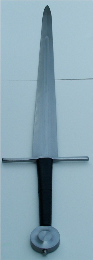 The AT 1434 is one of those "unclassified" war swords that were so common in the 14th Century. The sword displays a lenticular cross-section all the way to 1/2" before the point, at which time it has a small median ridge. The 1434 and the 1433 are both war swords, meaning from horseback they could definitely be used one handed, but they are really balanced for two handed use for average sized men (people over 6'4" with proportionate arm length would find these comfortable for large single handers). The photo specimen is outfitted with a 8" leather over fine cord hilt, large chamfered disc pommel and shows the black oxide furniture treatment. Here are the stats: