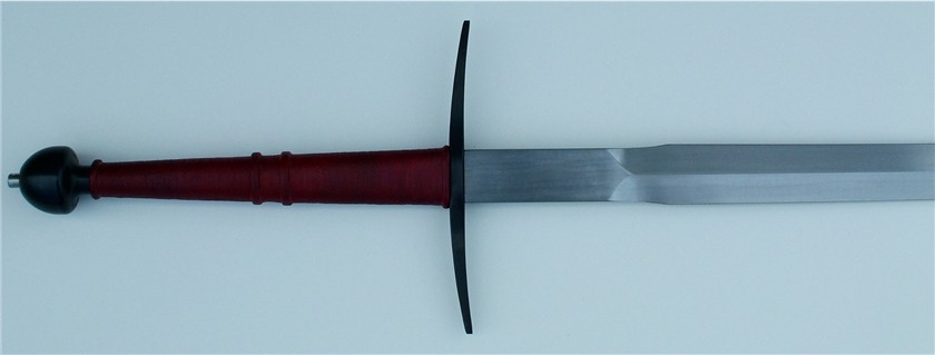 The AT 1563 is long XIIa styled blade. It is not based on any historical model, more it evokes the aesthetics that a 15th century dueling sword may have had (the Germans were known for keeping the large cutting blades in use longer than the rest of the continent). The hilt on this is oxblood leather over fine cord, four total transverse ridges.