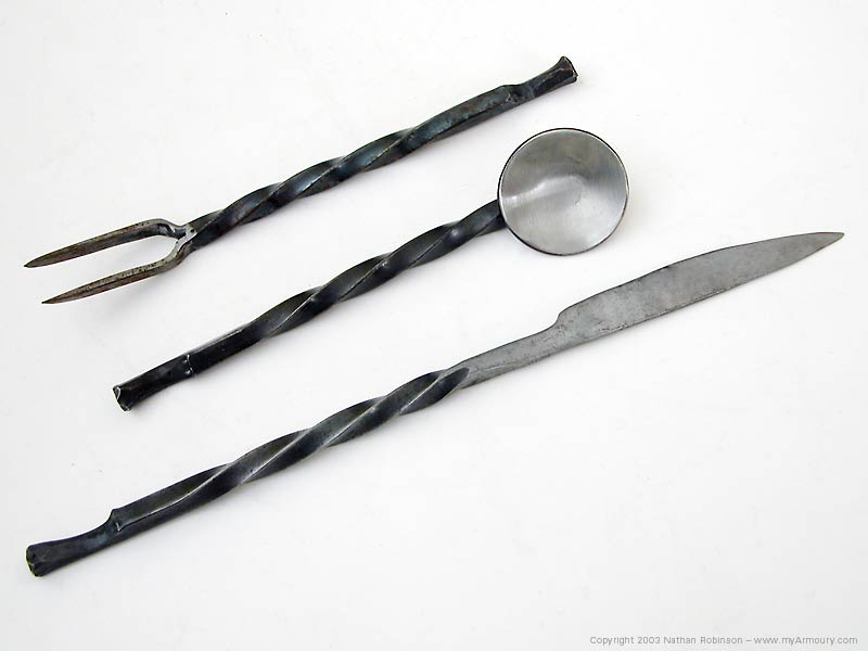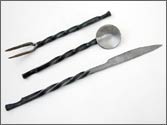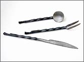 This rustic eating set comes direct from the blacksmith's forge. It consists of a knife, fork, and spoon and is embellished with twisted handles ending in a dragon's head and face