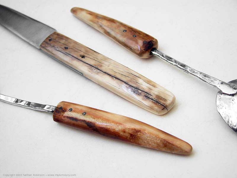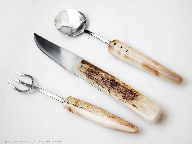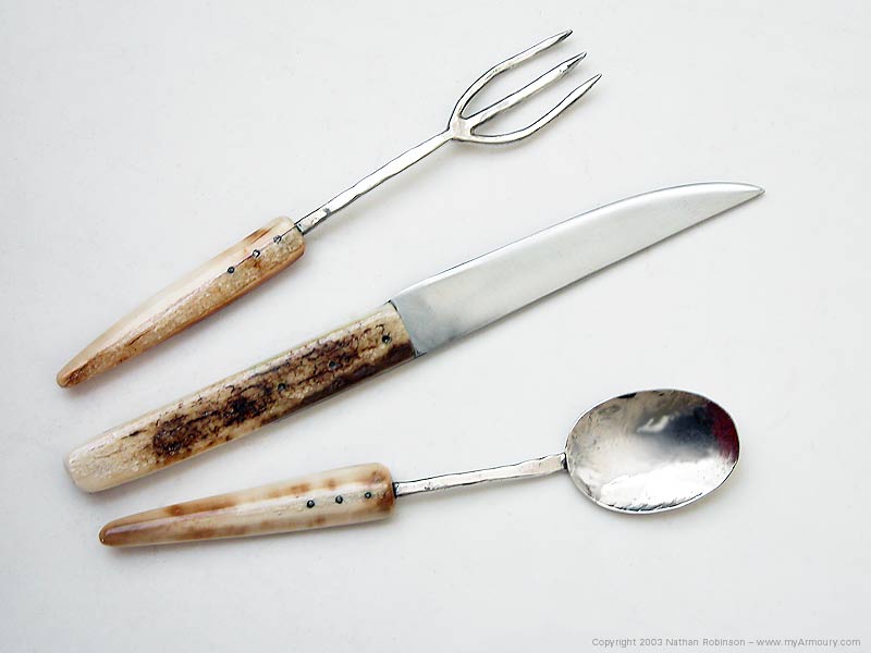 From my notes: Three-piece set fitted with stablized walrus ivory handles. The spoon and fork are made of sterling silver and the knife is made of O1 steel. It's made by a well known American knife maker/artist, but I've long lost the name. So we'll consider it anonymous.