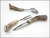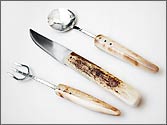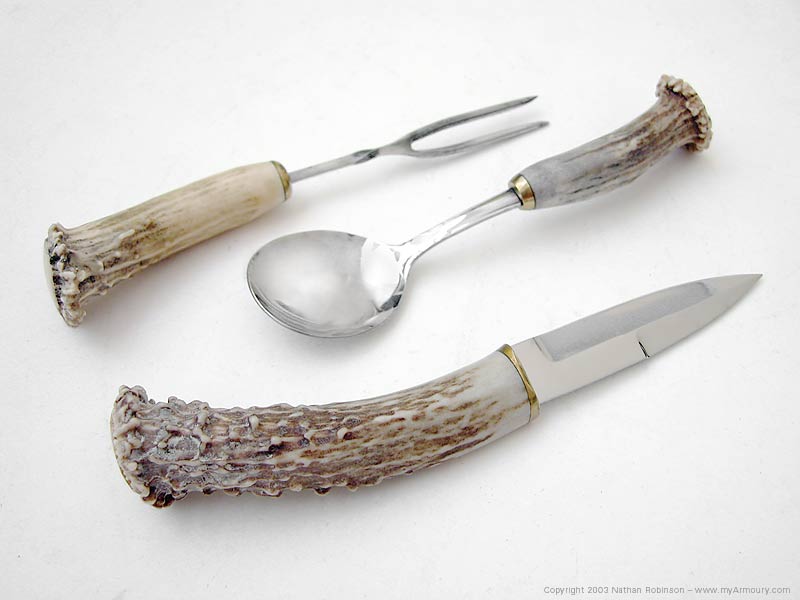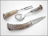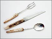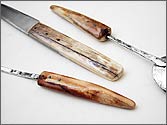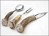 This three piece set, made by Bill Stroman, is fitted with antler crown handles and 440c stainless steel. There is a leather scabbard/holder for the knife/fork included, but the spoon is on its own.