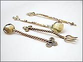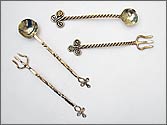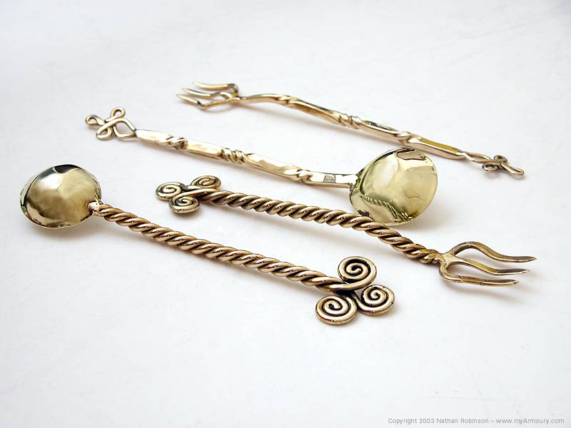 These two eating sets each have a fork and spoon and are made of solid twisted and shaped brass. One is square bar, the other is round bar.