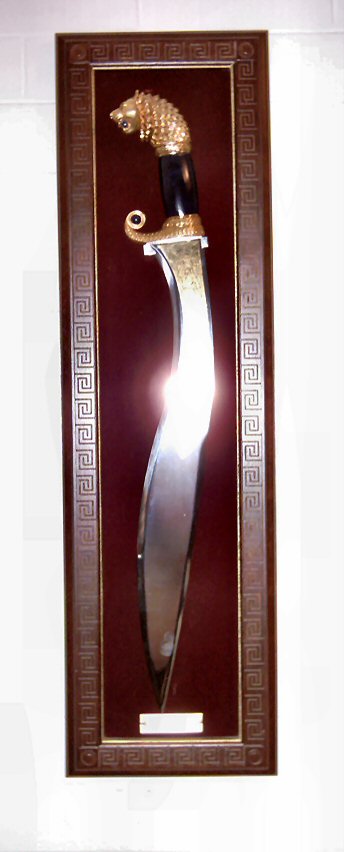 I am trying to find a special sword that is made by Franklin Mint. It is called the sword of Alexander the Great. It comes in a frame and it has the shape of a Greek kopis or falcata. It has a gold plated lion head on the handle with a black grip. If anybody has one or knows where I can find one please email me or post a reply. Please check out the attachment to see what the sword looks like.