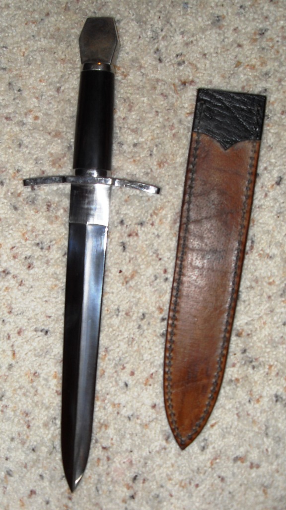 Item is the Valiant Armoury Crecy dagger. Sharp carbon steel blade with hardwood hilt. Comes with a leather scabbard.