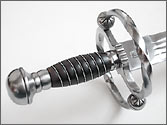 Double-edged blade with triple fullers; twisted s-shaped guard with fancy finials, leather covered grip with twisted accent wire; ball pommel and decorated quillon block.