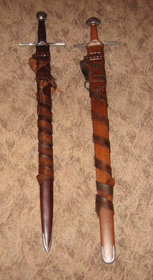 The customisation was done by Valiant Armoury Custom sword shoppe. Mr. Sonny is a great guy, he listened to my ideas and came spot on to what I had in mind. I ordered a different style of suspension, different color sheme, trilanguar rainguard and slight aging of the sword. The colors of the leather are reddish brown for the scabbard and sword grip and dark brown for the suspension system and belt. I think this adds to the overall combat worn look of the sword.