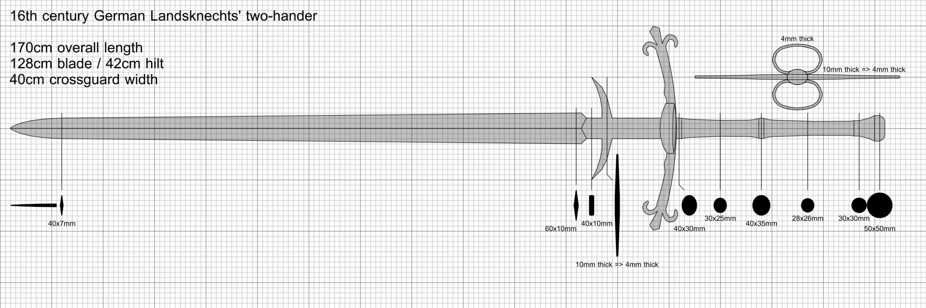 I'm a computer game developer and I need to produce an accurate model of 16th century two-hander used by German Landsknechts. I would be grateful if you can take a look at the scheme of my sword model attached to this post (for some reason it doesn't show a preview of the scheme, just a link )and tell me if you see anything wrong with it. I did my best using reference photos, however some things are hard to judge from photos. Mostly thickness of parts - crossguard, side rings, parrying hooks and grip. I'm concerned that my estimates might be too thick.