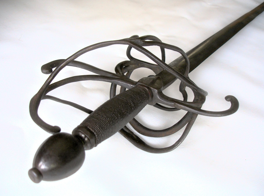 The components of this rapier appear to be Italian in design. It has a very long thrusting blade of the type typically seen in the fencing works of masters like Fabris, Capoferro, Giganti and Alfieri, which was very appealing to me, since this is the style of rapier that I study, and this is exactly why I purchased the sword.