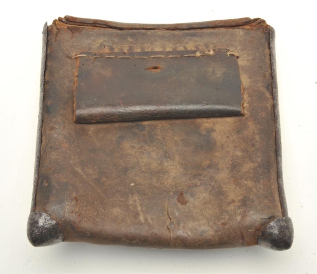 Rare Saxton gun accessory pouch from 16th to 17th century constructed of hardened leather mounted with forged steel decorations that were originally polished bright. Measures 8” in height by 7” in width. In very good condition with minor imperfections. Intended to carry spanner wrench, balls, paper cartridges or accessories for Wheelock or early flintlocks’ As seen in old engravings of musketeers