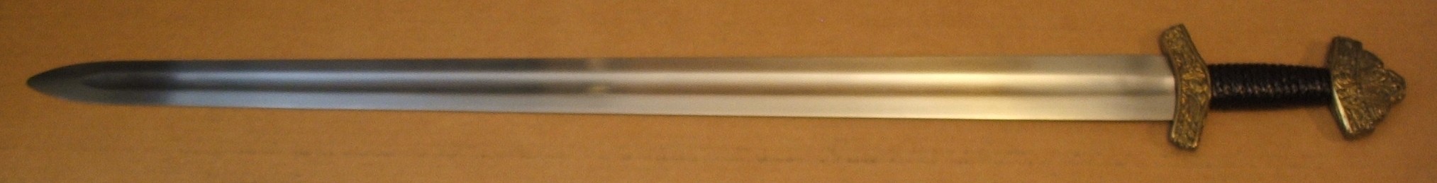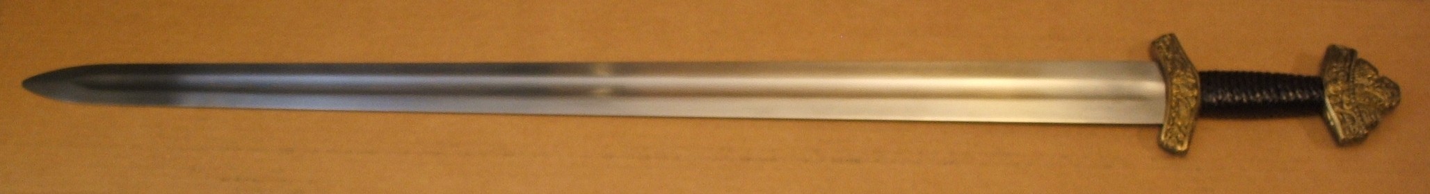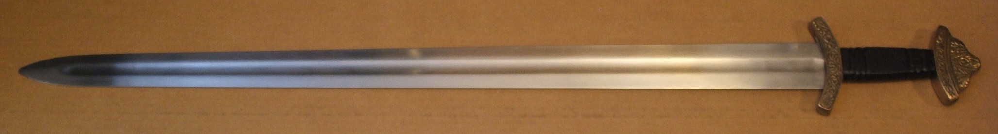 Displayed but never used. Bronze pommel and guard; leather-wrapped grip. Blade is unsharpened. No scabbard.