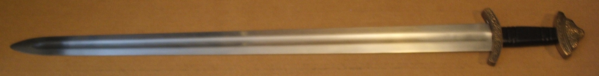 Displayed but never used. Bronze pommel and guard based on the Dyback sword; grip wrapped with a leather braid, which I’ve dyed black—the original color was brown. Blade is unsharpened. No scabbard.