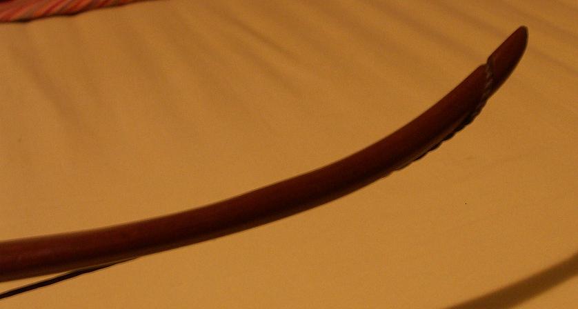 the bow is of flatbow form, with rigid raised handle and recurve tips, the handle is bound with leather of magenta colour,
