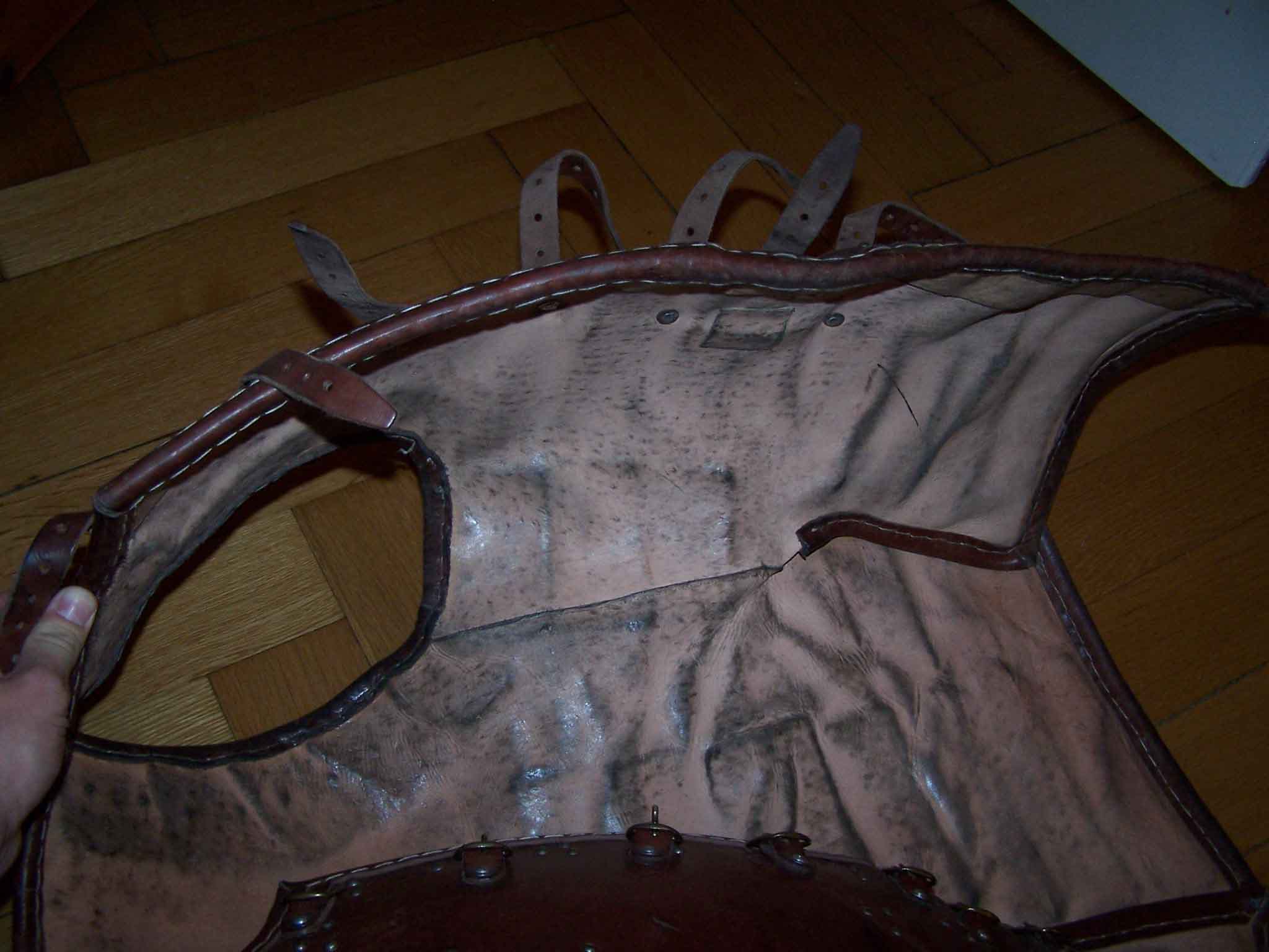 The brigandine is used 3 times, so it shows some scratches and also some dark marks on the inside, which come from the chainmail. All edges are lined with extra leather stripes, which are sewn to the brigandine itself. Around the arm holes, the yarn broke two times, what comes from the chainmail, I wore underneath. But This is just an optical matter.
