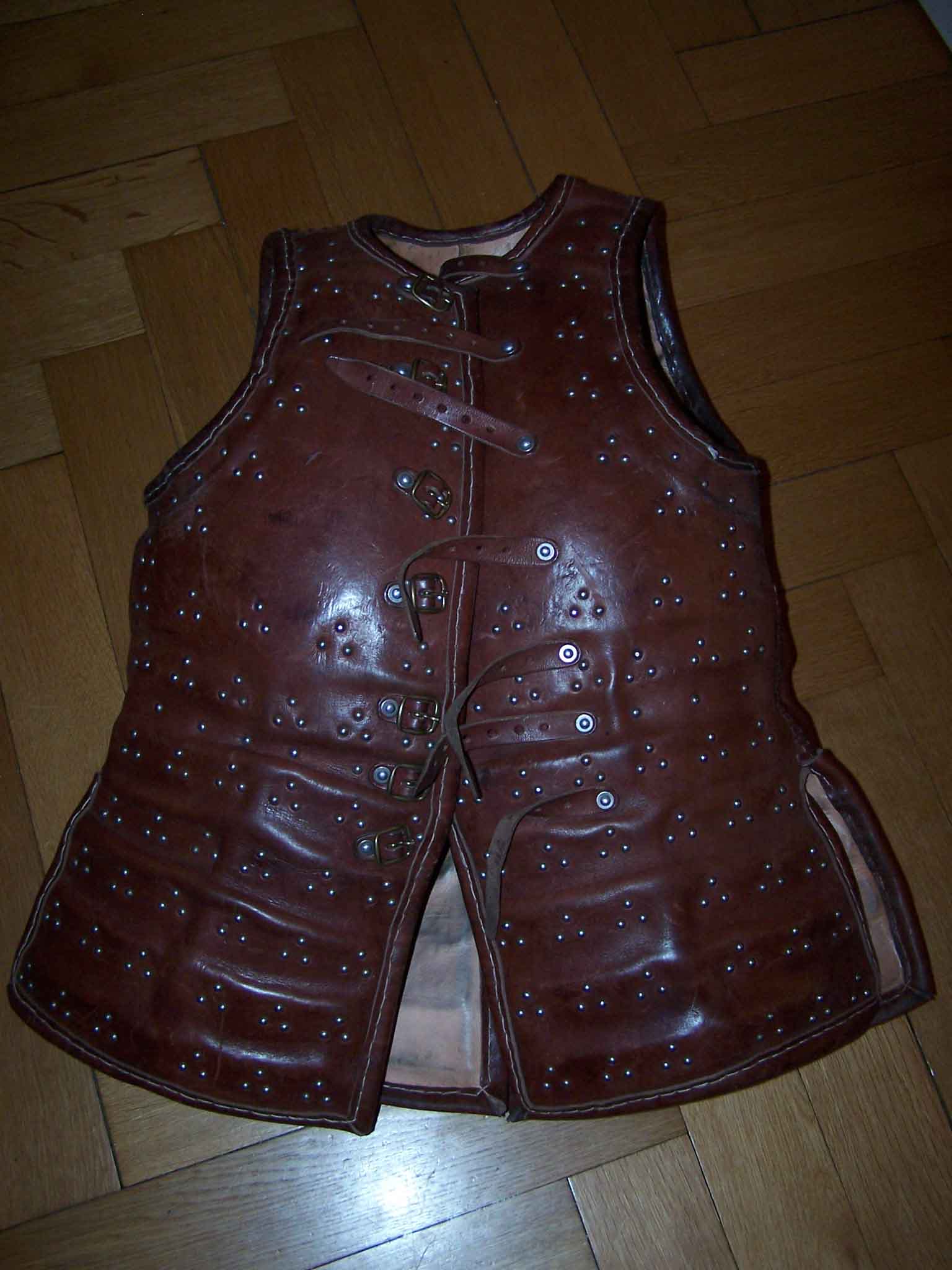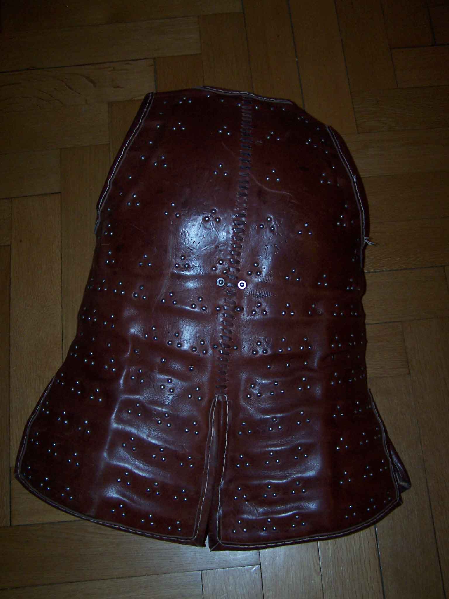 Leather cover on the inside and outside, inside non-coloured, outside dark brown/red leather, core made of 1,5mm metal sheets, riveted to the leather layers. The chest is made of bigger plates, which offer vbery good protection. The lower parts of the brigandine consist of small plates, that allow some movability aroudn the hips.