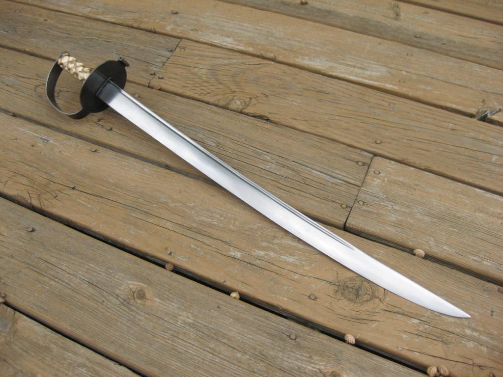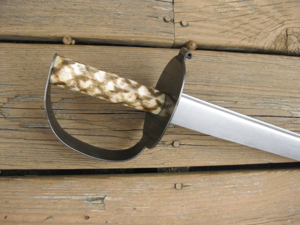 This is a reproduction of an American naval cutlass c. 1760. It is based on one pictured in Swords & Blades of the American Revolution (pg. 185, 370.S). The sword has a 25" hand forged blade of high carbon steel. The metal guard is formed from sheet steel and has been aged to a dark grey color. The tapered octagonal bone grip has been decorated with a dyed lattice work pattern to match the original sword. There are a few natural checks in the bone (as is common), but the entire grip has been stabilized inside with epoxy and it is very solid. As with a true cutlass made to be stored in an arms locker aboard ship, this is a no-frills, munitions grade sword that does not come with a scabbard. Price of $280