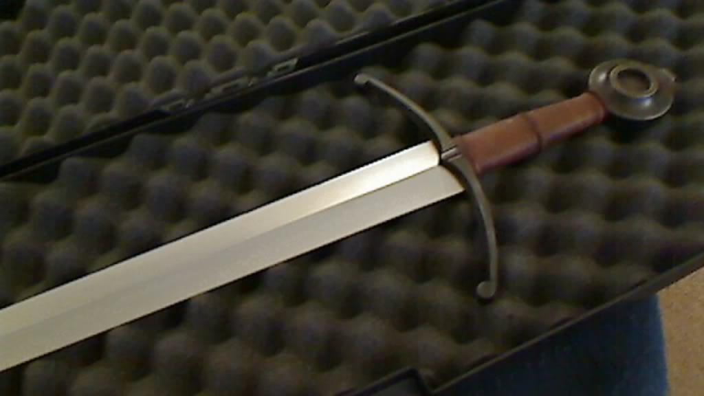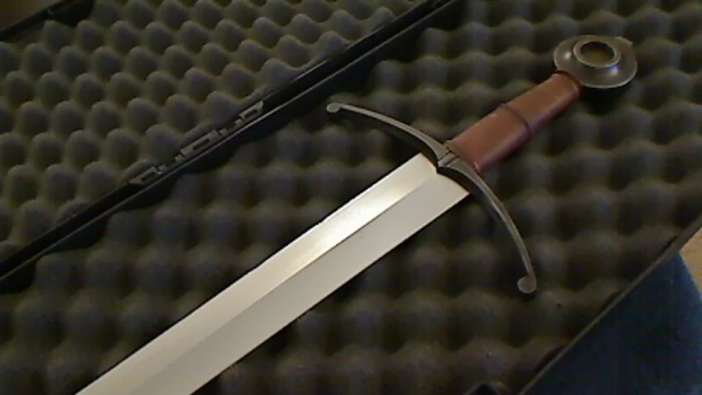 The leather grip is "campaign worn" light brown and the hilt fittings have been antiqued. Included is a black plastic foam-padded rifle case. The sword has been dry handled (never cut with), oiled, and some very minor rust polished out with Noxon7 and fine grit pads (the gray Scotch Brite pads as recommended by owners of Albion swords) - such spots (note that they have since been removed) are par for the course with owning these types of blades for any length of time as part of routine maintenance but I thought it was worth mentioning.