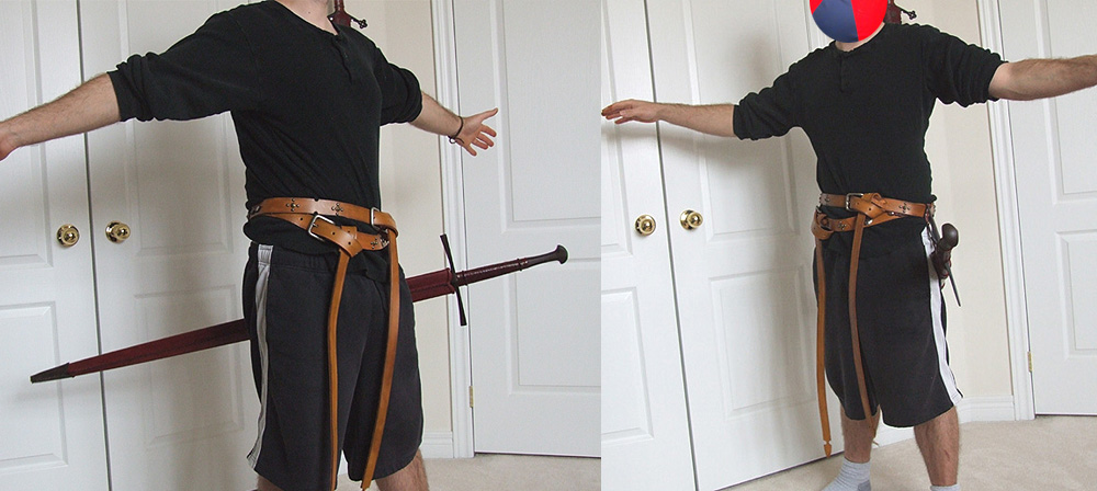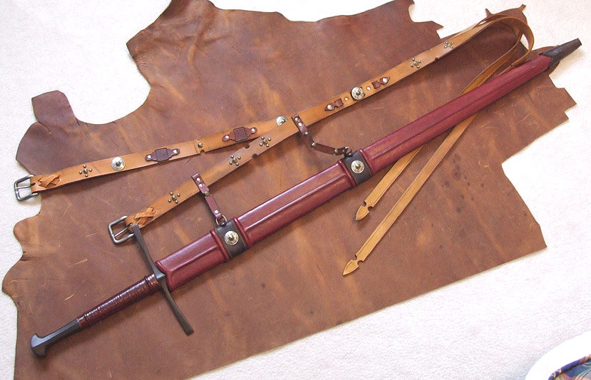 I am now including for free with the purchase of this sword a custom made scabbard and suspension. the scabbard is made of wood , covered with 3 oz. cowhide leather with an antiqued cherry finish, the belts are hand cut from thick and strong leather, decorated with studs, conchos and other embelishments. this is a very large sword, the belts are made oversized to accomodate the largest of sizes, there is lots of room for adjustment. heavy duty, nickle plated, simple design buckles are used to secure the belts.