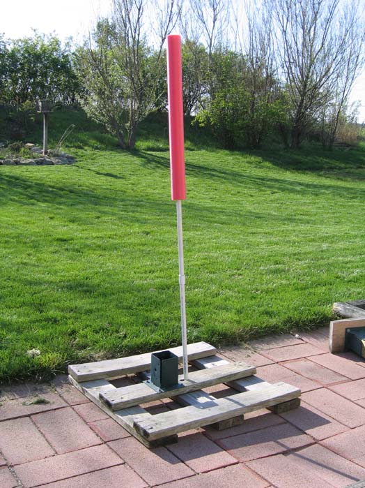 I use the stand below, made of 2 x 6's with a hole drilled through two of them. I've also added a bracket to hold a 4 x 4, to which is bolted a platform for fruit/water bottles, etc. The whole rig is heavy enough that it won't be knocked over easily. But it's smaller thana shipping pallet, meaning you can get fairly close to it. It's no more than 3 feet wide in any direction (I think the boards are actually around 30 inches).