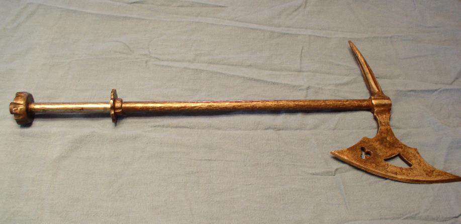 The axe is an all steel horsemans axe ( the inclination of the blade forward indicates it was for use on horseback ) from the later 16th cetury . The handle was a very bad replacement which we removed and are going to replace . The gauntlet