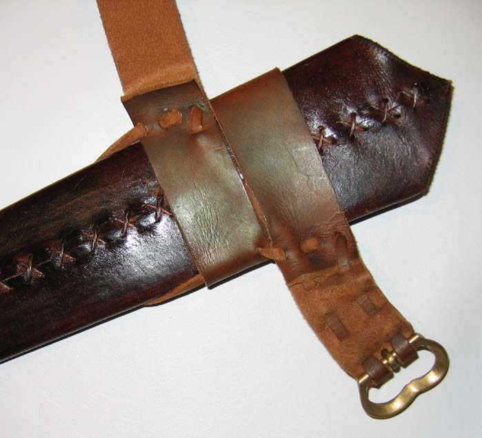 I don't think I have a pic of the back either as there's not much to see. Each of the 2 bands around the scabbard double back on themselves. The thong keeps everything tight. It's very simple. :)