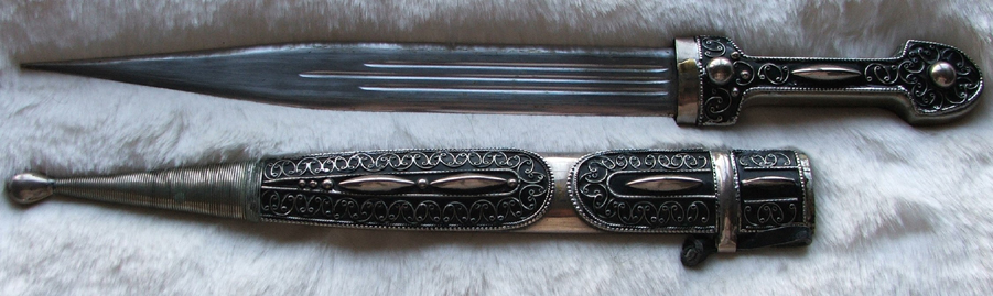 A nice example of a Kindjal, not antique but actual age uncertain - 40 to 50 yrs estimated - 44 cms total length sheathed, blade 27 cms, double-edged, fullered dagger. Sheath and handle decorated in black and silver with a filigree design. Other examples are available in a variety of designs and ornamentation. I am disposing of a large collection of these as part of an estate - all were purchased in Georgia during the 1970s.