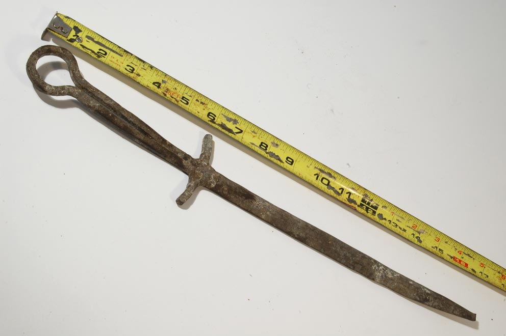 So, it could be a pavilion stake made from what looks like bronze bar stock (in the tang area), with both a curved crossbar and a ring to attach ropes to, but then modified with a grinder into a double-edged, sharpened blade. Thanks, guys, that could work possibly.