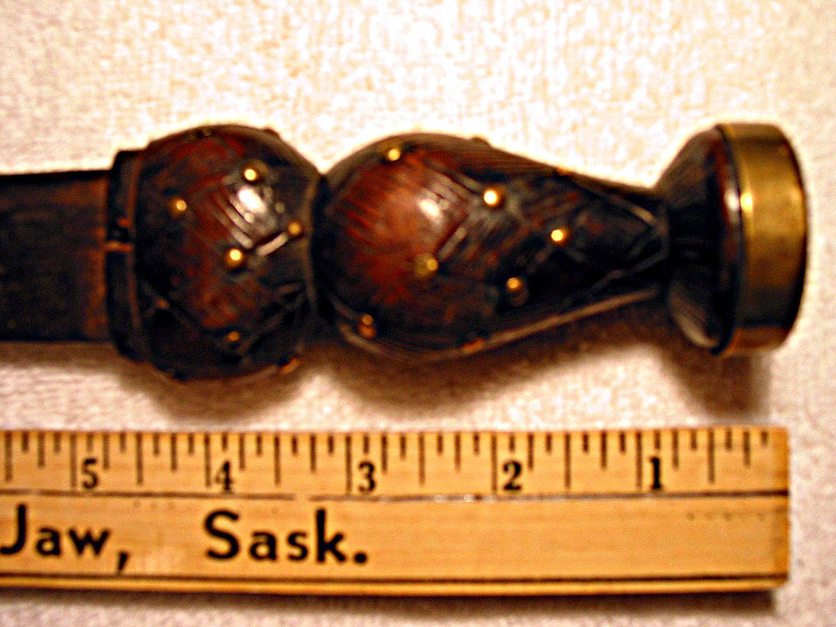 It is hard to be definitive from just the photos but it appears to be a 19th or early 20th c. regimental dirk. The basket weave pattern on the grips and the metal studs at the intersection of the patterns are a common feature of those knives as is the exaggerated shape. There was a metal fitting on the lower end of the grip, where it meets the blade, which is missing. Can you see any markings on the blade or elsewhere on the dirk? Is there a sheath?