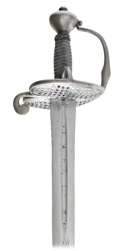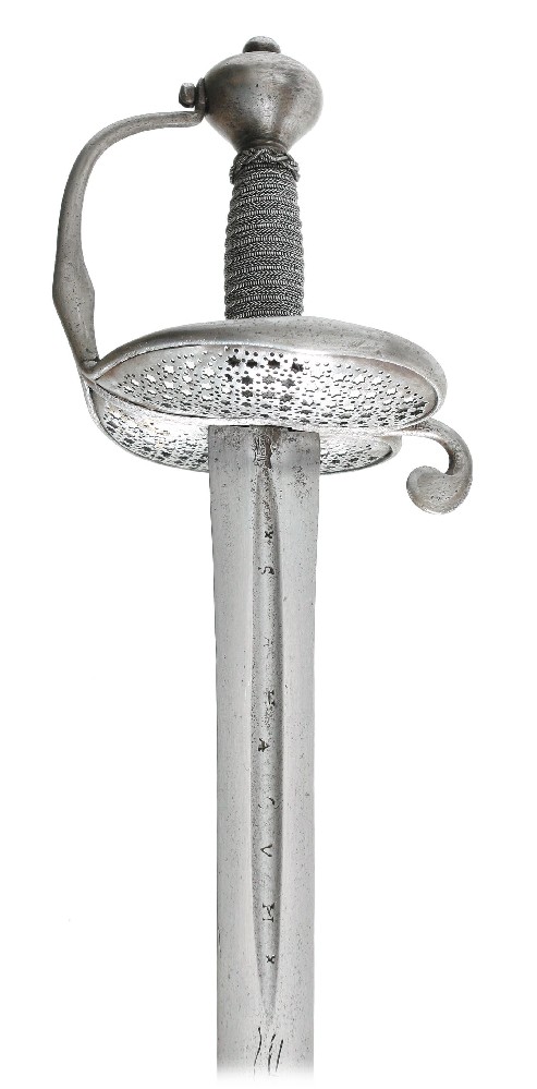From Hermann Historica, another of those Amsterdam Town Guard Walloons, dated 1650, with an 108cm overall length. Many of these swords have "Sahagum" engraved in the fuller. Sahagun was the name of a famous Spanish swordmaking family. The name got abused and mispelled,much like Andrea Ferrara on Scottish baskethilts, so people thought they were getting a fine Spanish blade instead of one from Solingen (not that there's anything wrong with a Solingen blade).