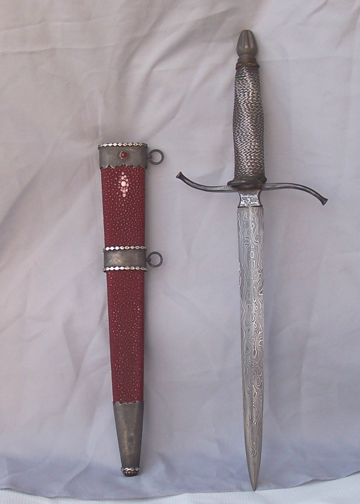 I'm not a vendor or dealer & only have this one dagger for sale. One of a kind, ring-hilt, parrying dagger replica in the style of mid 15th to 16th century. 12 inch blade of handforged damascus steel in a random pattern, using L-6, 52100 and 1018 steels:448 layers. Distally tapered and in length from 1.25 at the ricasso to .50 at 1 inch from the point. OAL is 18.5 inches. Ring guard & pommel are forged from plow steel cable. The fluted pommel & crossbars are set with 14K in the ends. Grip is hickory, fluted and covered with red leather and wrapped with sterling silver twisted wire in 5 strand chevron;5th wire is square and also twisted. Finished with twisted brass turk's head knots. Pommel is threaded, not peened, so dagger will dismount completely. Sheath is hardwood covered with red dyed stingray skin and lined with red leather. Chape & locket are sterling silver, stippled and set with red garnets. All sterling is antiqued. Price is $1000.00 +shipping & insurance. Please PM me if you are interested.