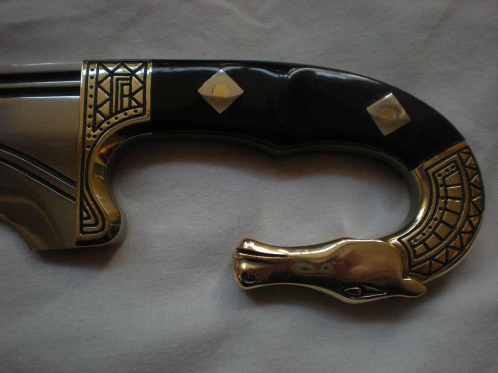 Really beautiful sculptural work on the horse head Paul. It suits the blade and the whole thing has a nice flow. I like the dark incised lines against the bright brass. Can you tell us more about your brass shaping process? Do you use hand files? Power tools? Did you happen to take and progress shots of the sculpting? Very impressive and very lovely.