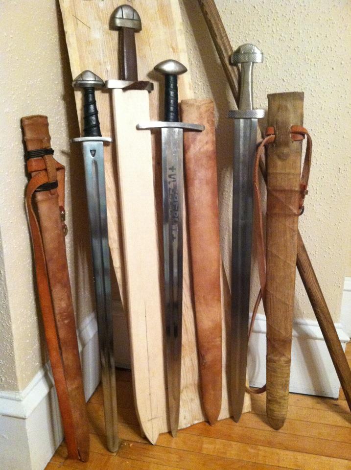 Here are some I've made, some of which are still in-progress The second from the left is the rough shape and I'm planing it this week. It's a DSA blade (blunt for the kiddies) made for the museum where I work. The second from the right is a scabbard nearing the end of construction. All have lanolin-oiled wool interiors. I put a layer of waxed linen under the leather. One of these days I'll try some metal fittings. Thanks to you all for your great postings!