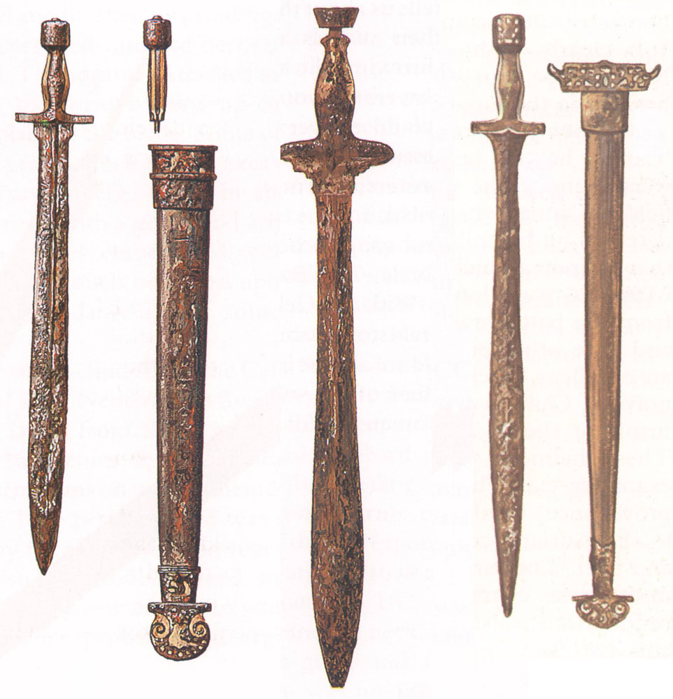 "Suspended from the harness of his cuirass on the right side, the Caprestrano warrior has an elaborately decorated sword. An almost identical sword was found at Alfedena. This was only one of a large number of iron swords and scabbards that have been found. These swords are all of Greek hoplite type probably adopted from the Etruscans. Their blade lengths vary between 60 to 70cm. The handles and the top and bottom of the scabbards of these swords are made of bone covered with iron. This iron facing often has pierced decoration so that the bone shows through."